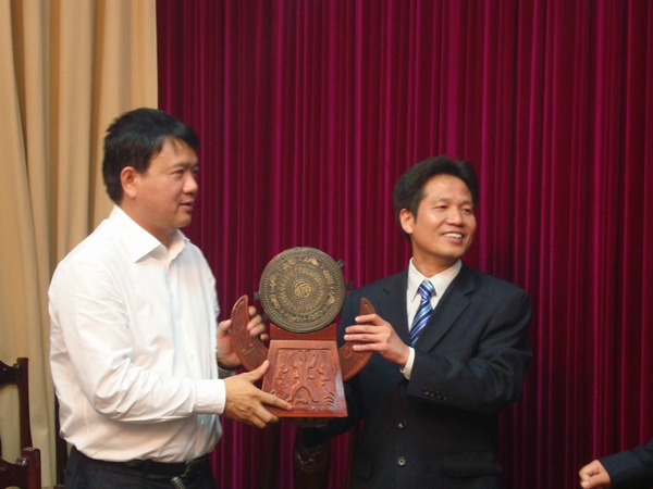 集團(tuán)公司董事長朱堅和(上圖右)與越南交通運輸部部長丁羅升先生交換禮物。