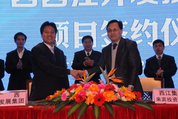 圖為:2月27日,圖為朱堅(jiān)和董事長(左)與廣西西江開發(fā)投資集團(tuán)代表簽署合作意向協(xié)議
