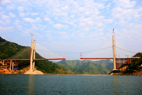紅水河特大橋是由集團直屬企業(yè)廣西路橋工程集團有限公司承建的一座雙塔雙索面混合式疊合梁斜拉橋,橋跨布置(213+508+185)米,主塔高