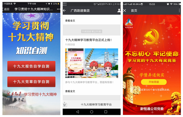 而廣西路建集團(tuán)、新恒通公司等直屬企業(yè)微信公眾號也開辟了十九大精神學(xué)習(xí)教育平臺,開創(chuàng)性地把知識性較強(qiáng)的黨建知識競答與趣味性十足的搶紅包結(jié)合到一起,寓教于樂,大大激發(fā)了廣大黨員干部和企業(yè)員工的學(xué)習(xí)積極性。