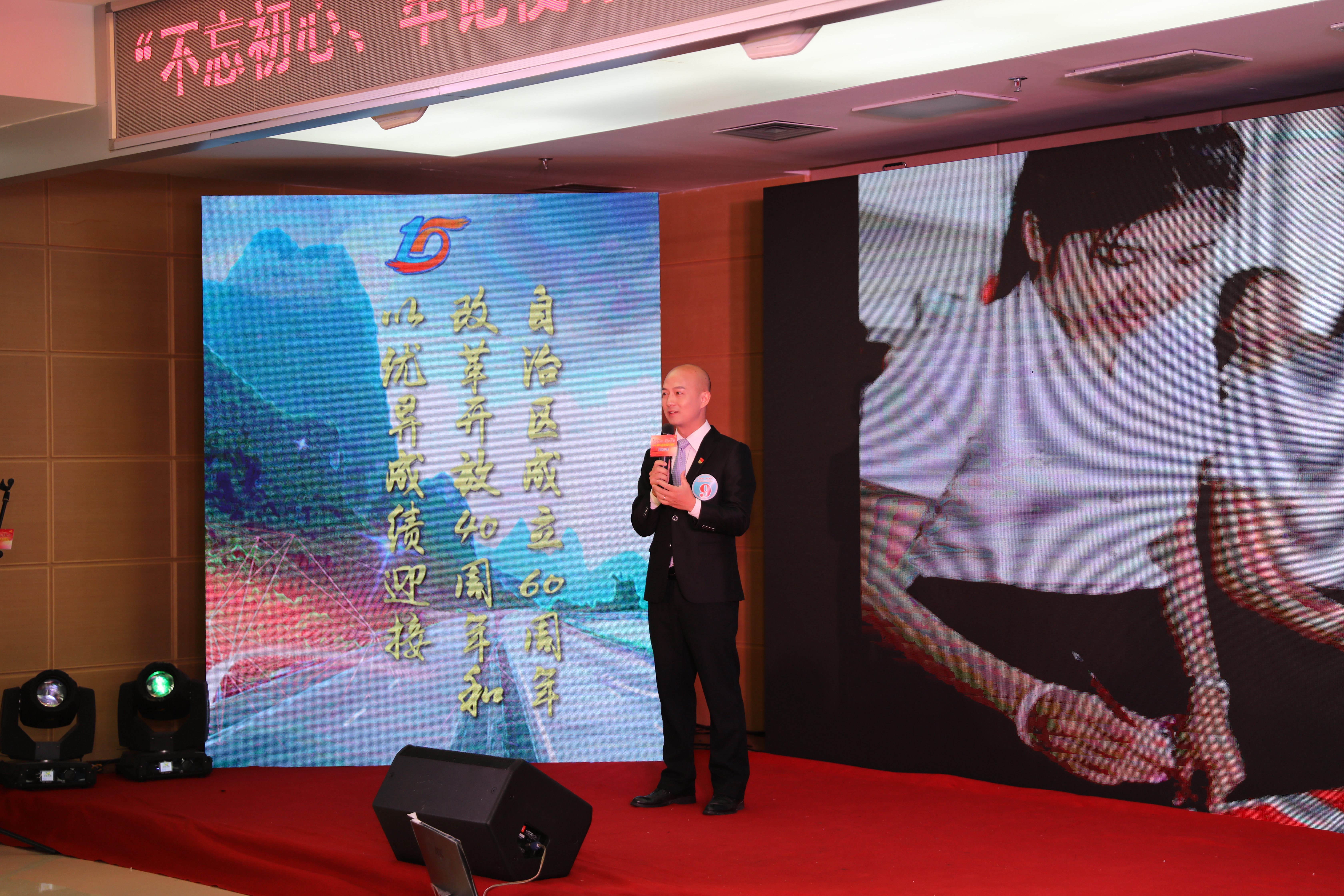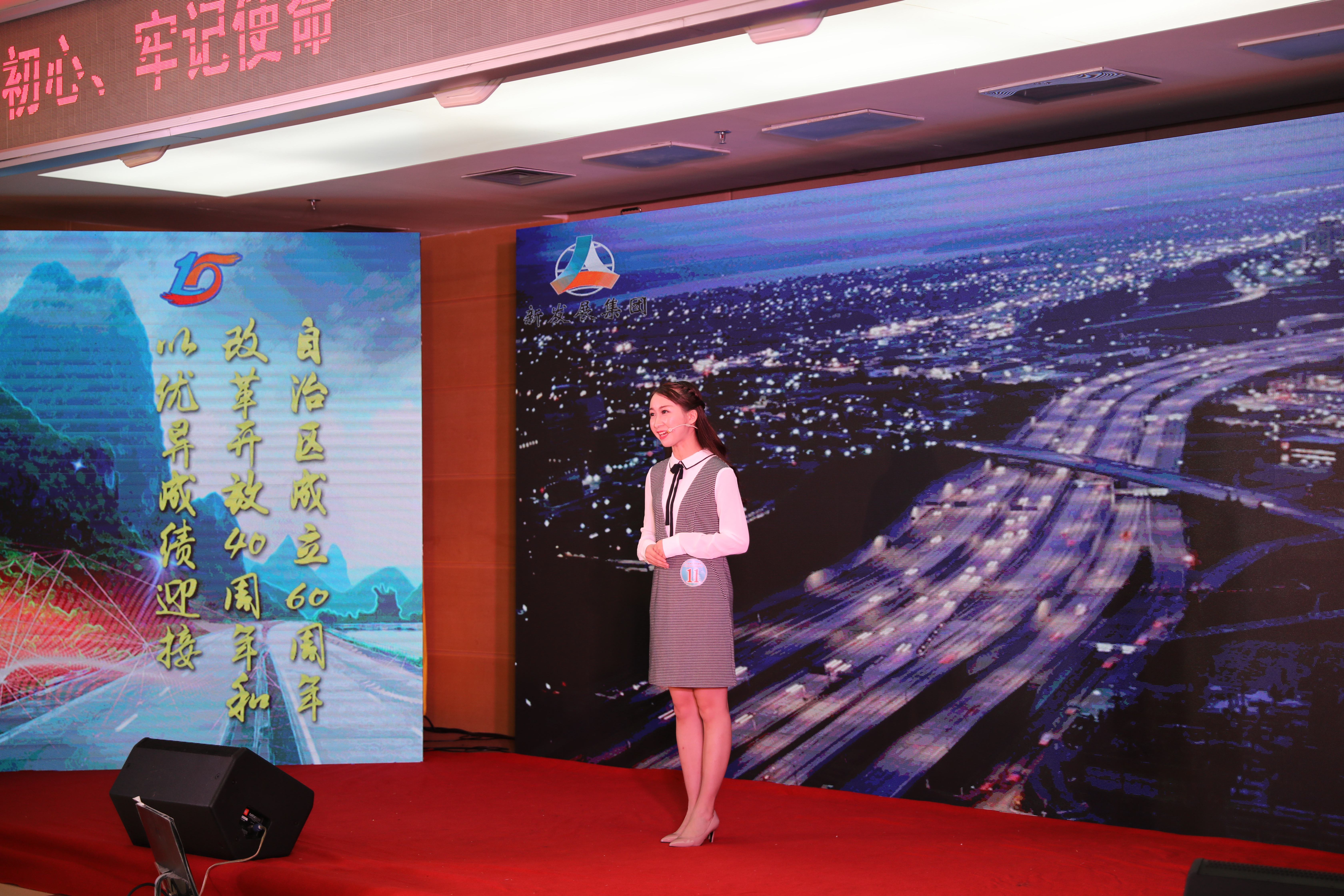 比賽邀請了自治區(qū)國資委宣傳群工處處長、黨委宣傳部部長吳雙平和廣西電視臺李力、高路、王繼修3位老師擔任主評委并為獲獎選手頒獎。集團公司領(lǐng)導(dǎo)唐咸秋、翁科出席活動現(xiàn)場并為獲獎選手頒獎。集團公司總部和直屬各企業(yè)員工代表近250人觀看了決賽。