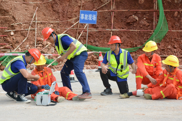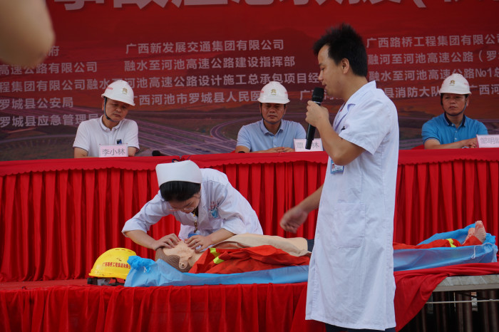 當(dāng)天的演練現(xiàn)場模擬情景為:2019年6月20日,在羅城縣四把鎮(zhèn)沖灣屯附近,融河高速公路K54+100高邊坡處現(xiàn)場4名邊坡防護(hù)作業(yè)人員正在緊張的施工,由于連續(xù)雨天上邊坡坡頂土體部分突然滑落,繼而出現(xiàn)大的滑坡裂縫,隨之大面積土石體坍塌,1名施工人員被垮塌的土石壓埋。事故發(fā)生后,參與演練人員及時(shí)報(bào)告和啟動(dòng)應(yīng)急預(yù)案,在坍塌現(xiàn)場設(shè)置臨時(shí)指揮部,指揮現(xiàn)場救援,將傷者抬出被困位置后,在演練會(huì)場進(jìn)行現(xiàn)場醫(yī)療和急救演示,再由救護(hù)車送到羅城縣人民醫(yī)院進(jìn)一步治療。